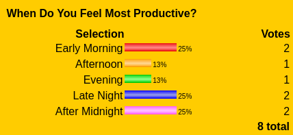 I chose After Midnight for when I felt most productive. I have always preferred staying up late to waking up early. Especially so I can play games with my friends into the early morning, but when I am not playing, I can get a lot more work done at night than during the day usually. I enjoy the dark environment, cooler waether, and fewer noises from other people.