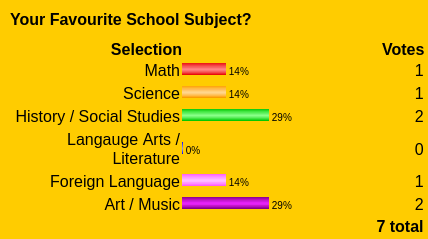 I was debating my choice this week again. I was super torn between Math and Science as my favourite school subject. I really loved solving math problems in school, but only went up to Calculus (along with some statistics and other classes for my Computer Science degree). However, what I thought was really cool about math was its application in science, especailly Physics. I loved how varried the results are though! I was honestly expecting Art / Music to be higher up on the charts, but not too surprised that language arts did not get any votes (as of yet).